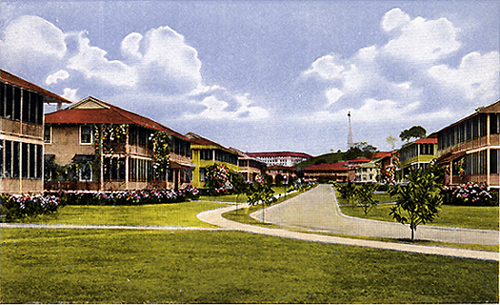 Very early colorized postcard of Carr Street in the Balboa Flats. This is a great photo showing how the housing looked prior to the newer style housing being built. The old wooden Balboa High School can be seen at the end of the road which was replaced with the cement building we all knew as the Balboa Elementary School at the end. The Administration Building can be seen on the hill. I found the multiple color flowers seen in the hedges and vines around the houses. The artist that colorized this originally black and white photo got a little carried away. We had colorful flowers, but not like these shrubs are showing. Another great image from our Canal Zone history. |