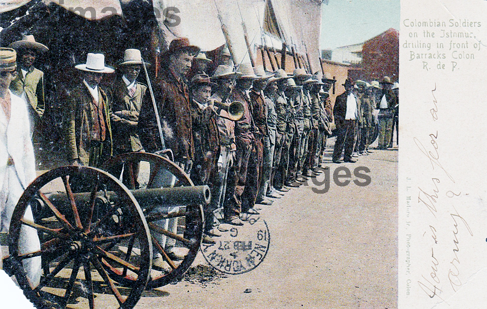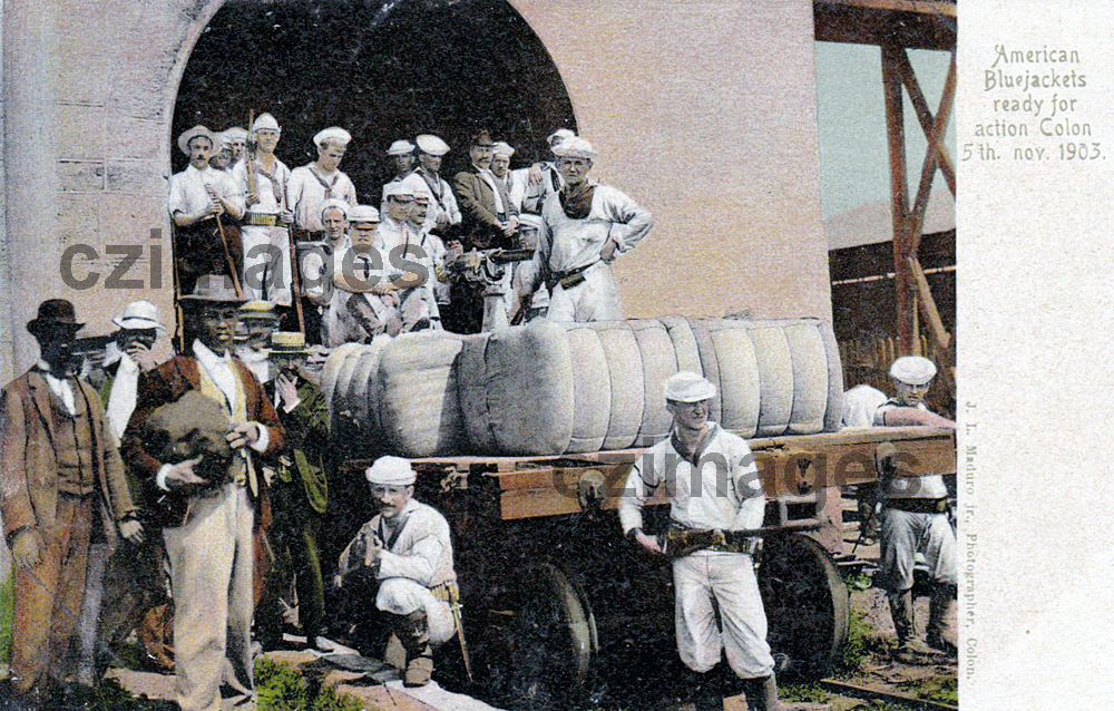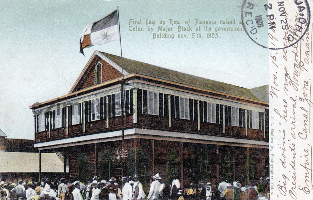 Today, the Independence Day of Panama from Columbia is celebrated. To celebrate this important day, we have three early colorized photo post cards by J. L. Maduro. The top photo is American Sailors / Marines at the Panama Railroad headquarters in Colon, ready to engage the Columbian forces to assist Panamanians to gain independence from Columbia, November 5, 1903. On the other side is the next photo below of the Columbian Soldiers in front of their barracks in Colon, November 5, 1903. At the bottom, after a basic engagement between the Panama and Columbia and with a show of strength from the U.S., the first flag or the Republic of Panama was raised at the government building. November 5, 1903